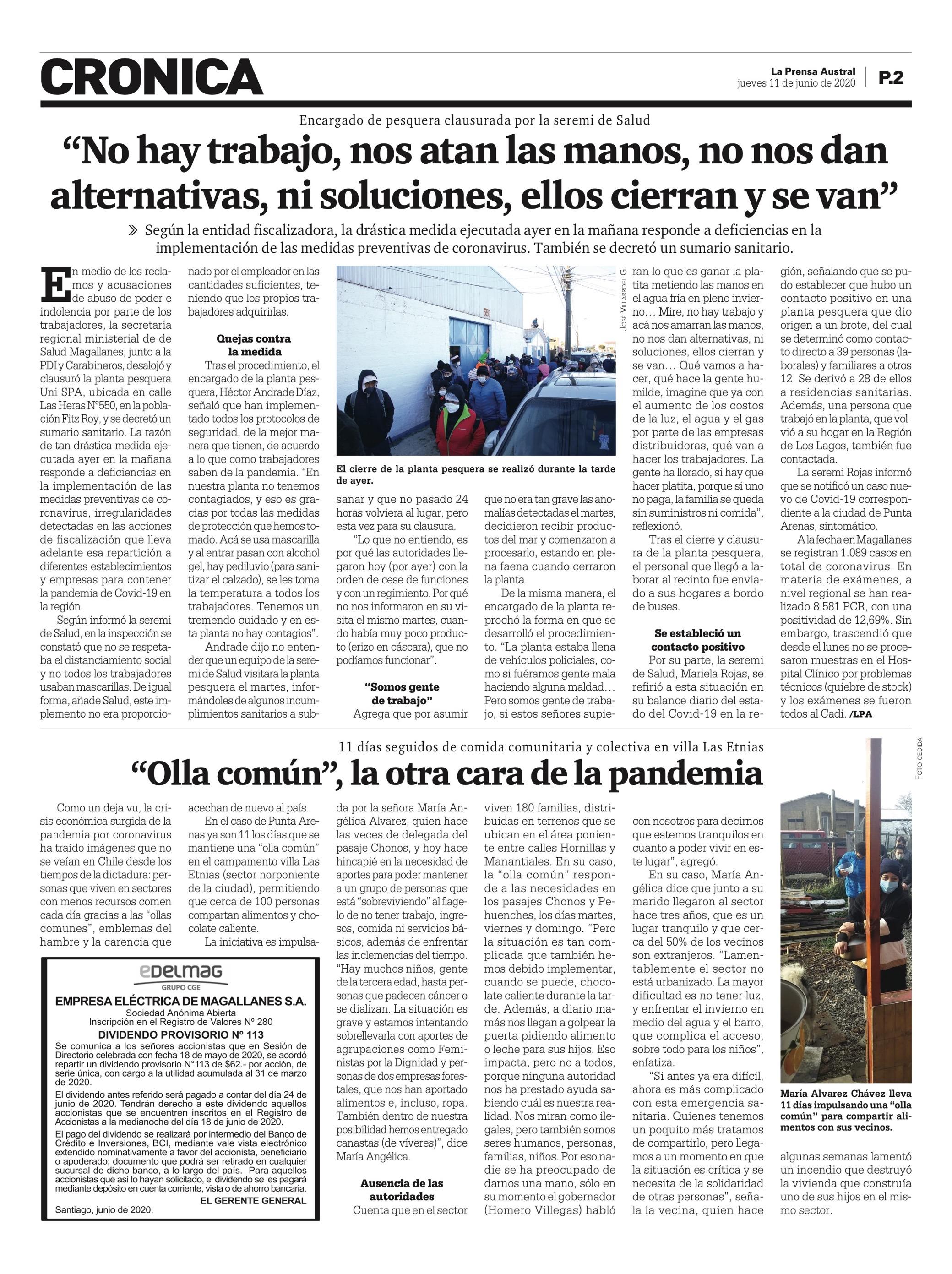 Pago Dividendo Provisorio N° 113- EDELMAG, diario La Prensa Austral jun-2020