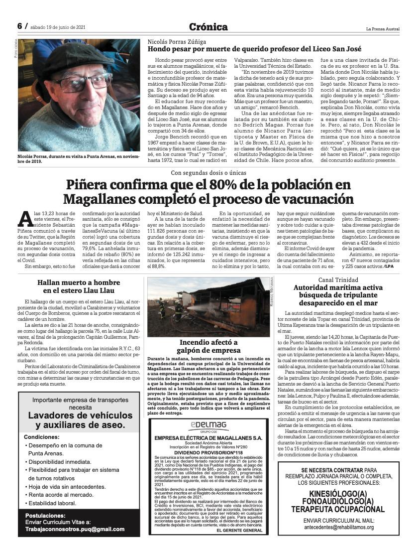 Pago Dividendo Provisorio N° 118 – EDELMAG, La Prensa Austral 19 de junio 2021